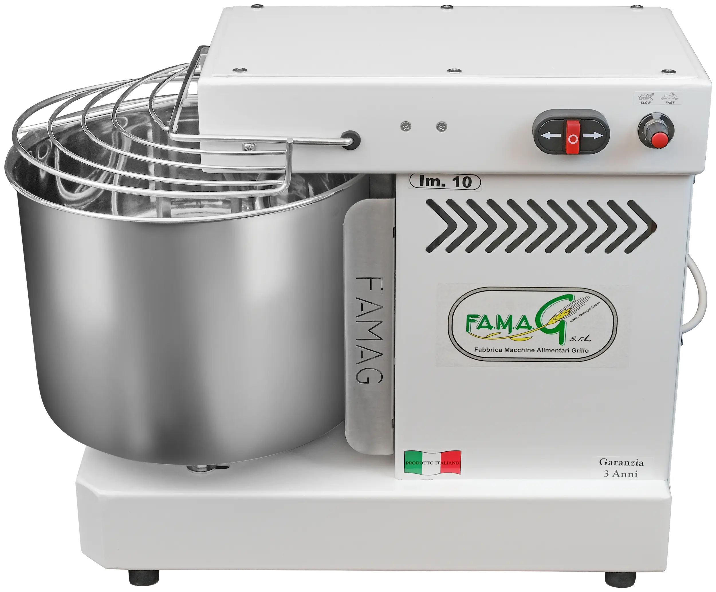 L'impastatrice FA.M.A.G. IM10 10 Velocità HH è l'unica impastatrice a spirale da banco che permette di lavorare contemporaneamente 7kg di farina + 3,5 lt di acqua in dimensioni ridotte. Dispone dell'inversione di marcia, molto utile per la preparazione della Biga. Grazie al nuovo motore Brushless è ancora più silenziosa ed efficiente. Permette di preparare impasti ad alte idratazioni con estrema facilità. E' tra le più piccole impastatrici a spirale da banco disponibile in commercio. Non necessita di alcuna manutenzione. Con le sue 10 velocità permette di realizzare impasti professionali con grandissima facilità. Progettata e costruita come le grandi macchine impastatrici, la IM10 10 Velocità HH trova il suo impiego sia per uso domestico che professionale. Non necessita di alcuna manutenzione.